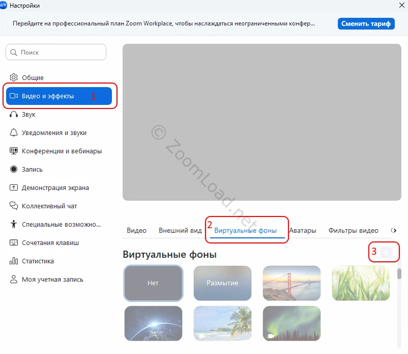Далее пошаговая инструкция по смене заднего фона или загрузки своего изображения или видео в качестве виртуального фона: