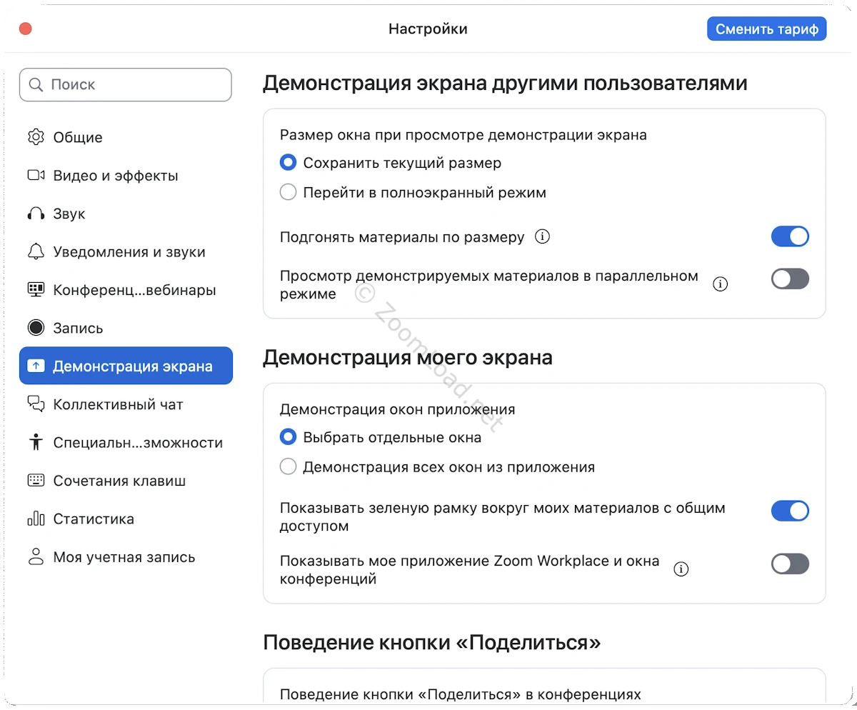 Раздел контролирует, как вы показываете экран и как видите демонстрации других. Демонстрация отдельных окон и зелёная рамка помогают избежать случайного показа лишней информации.