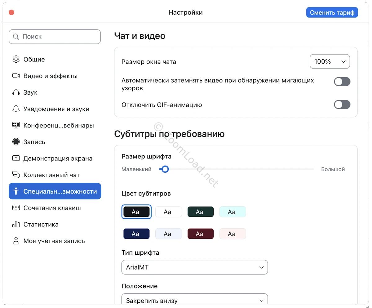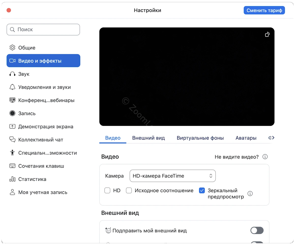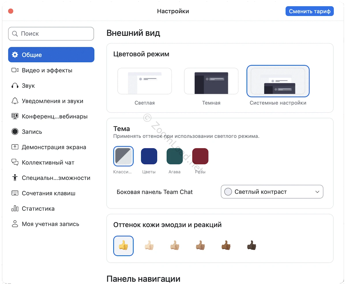 Этот раздел отвечает за визуальное восприятие Zoom и комфорт при длительной работе. На практике лучше использовать системный режим и стандартную тему - интерфейс будет автоматически адаптироваться под окружение и меньше утомлять глаза.
