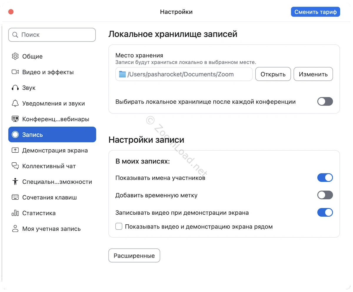 Здесь управляется структура и информативность записей. Для рабочих встреч полезно включать имена участников и запись экрана, а папку хранения лучше вынести отдельно от системных каталогов.