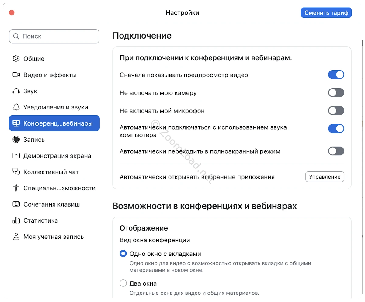 Раздел определяет поведение Zoom при входе в встречи. Предпросмотр видео и авто-подключение к звуку позволяют избежать неловких ситуаций, а режим одного окна удобнее для большинства пользователей.