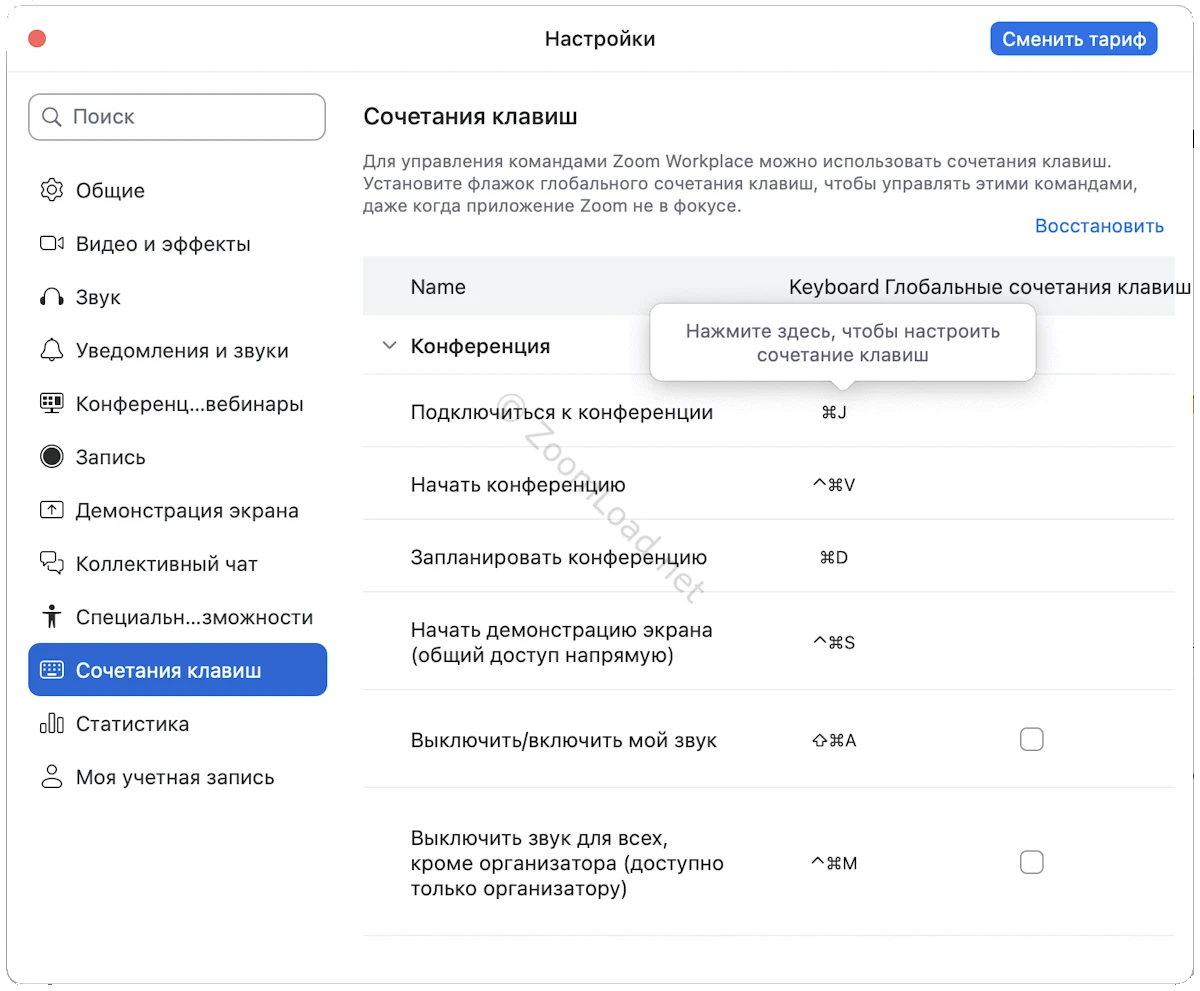 Раздел предназначен для ускорения работы с Zoom. Минимально имеет смысл запомнить сочетания для микрофона и демонстрации экрана — это заметно упрощает управление во время встреч.
