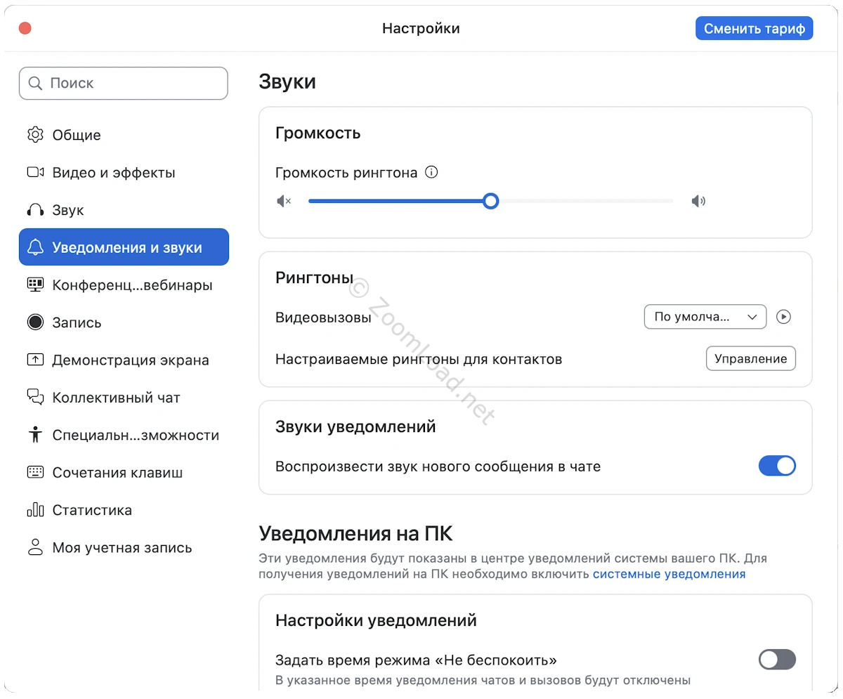Эти параметры регулируют, насколько Zoom будет отвлекать. В рабочем режиме обычно оставляют звук сообщений и включают «Не беспокоить» по расписанию, чтобы уведомления не мешали встречам.