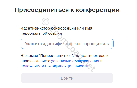На главной странице сайта нажмите «Конференция» и выберите «Присоединиться» или перейдите непосредственно на страницу ввода идентификатора встречи zoom.us/join, далее введите ID и пароль (если требуется).