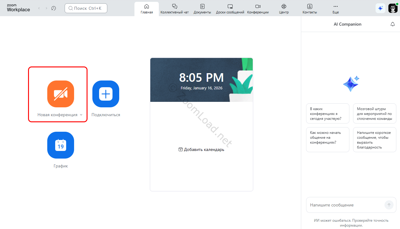 Нажмите оранжевую кнопку «Новая конференция» для мгновенного старта.